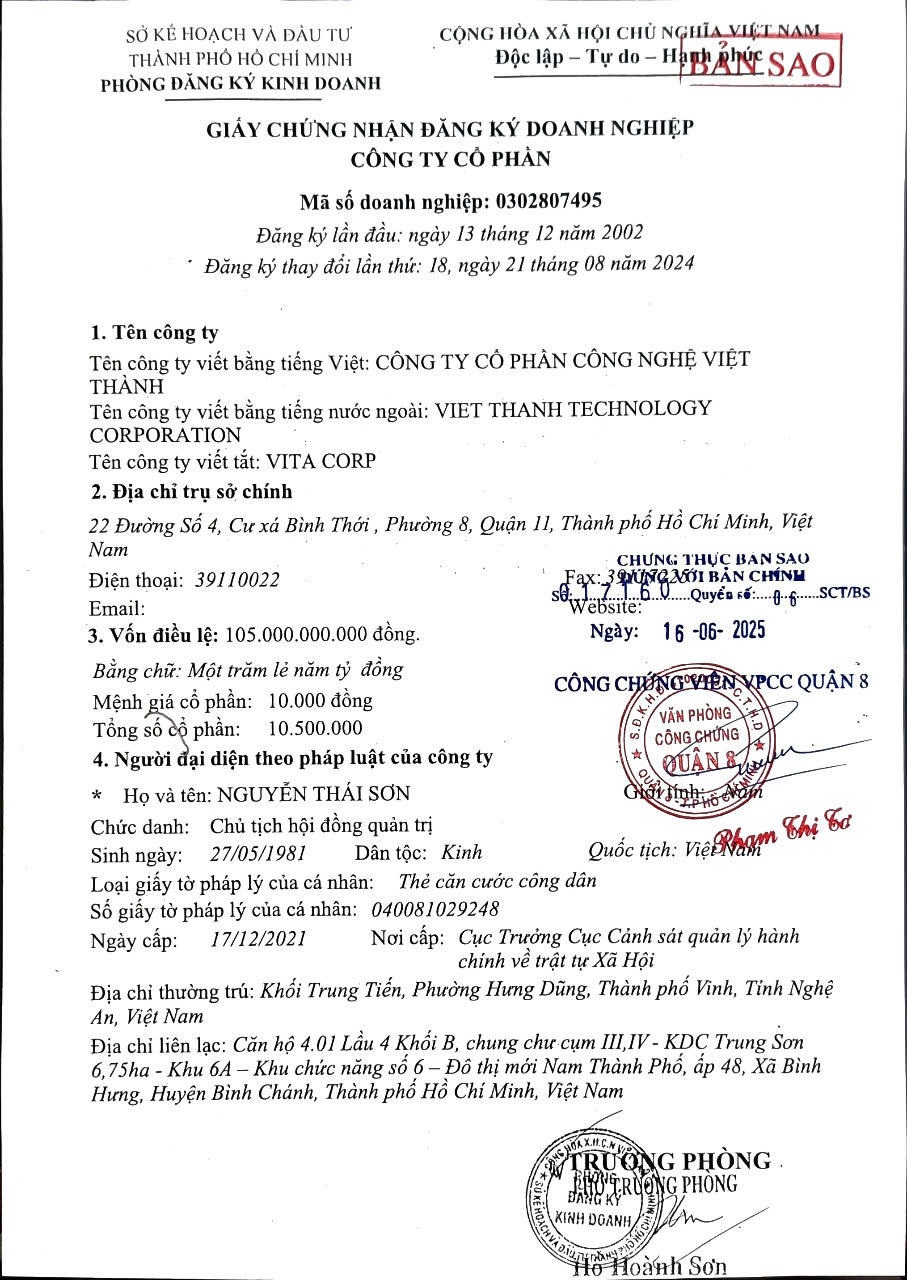 Điều lệ Công ty Cổ phần Công Nghệ Việt Thành. Phát hành lần 02, năm 2016